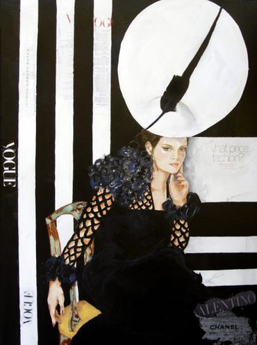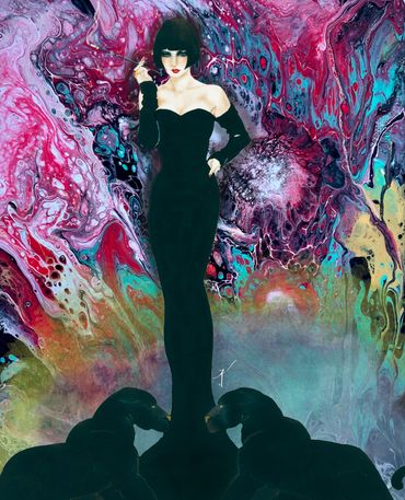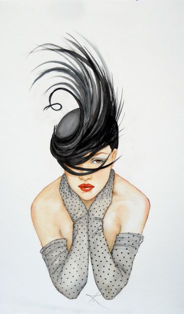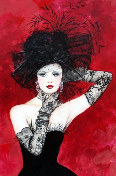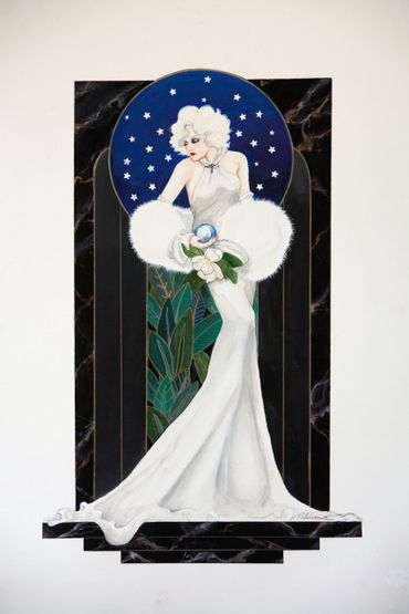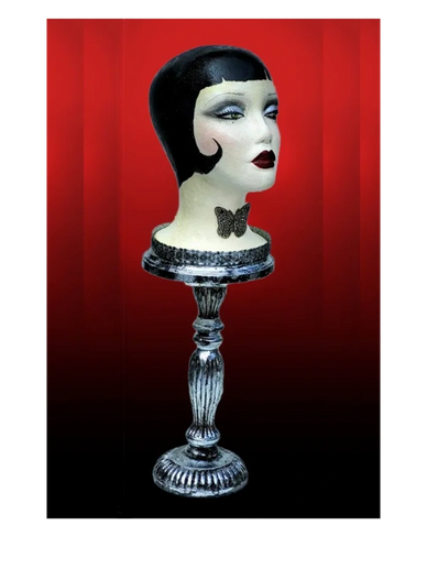 Deco flair with this art piece. Silver metal surrounds the piece. She has a black bob to accent her dark red lips.