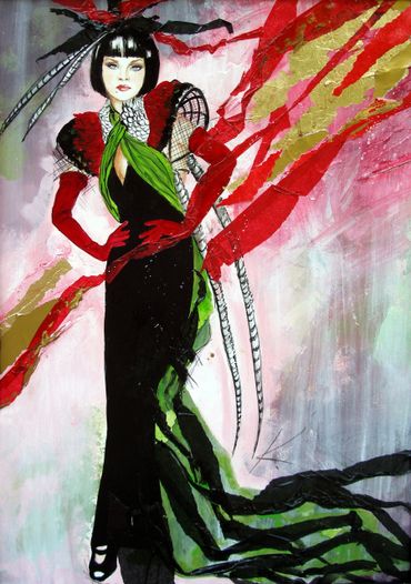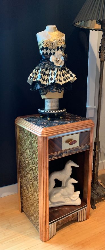 Fanciful harliquin dress with musical accessories such as a paper rose and musical base.. Gold leaf. Mixed media.