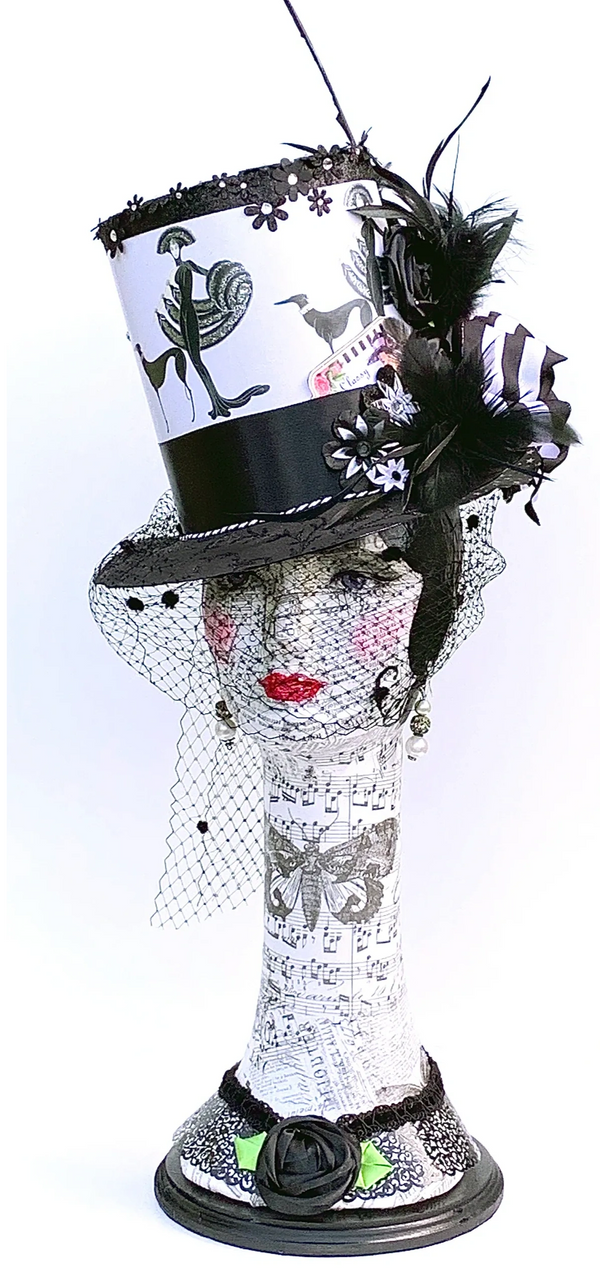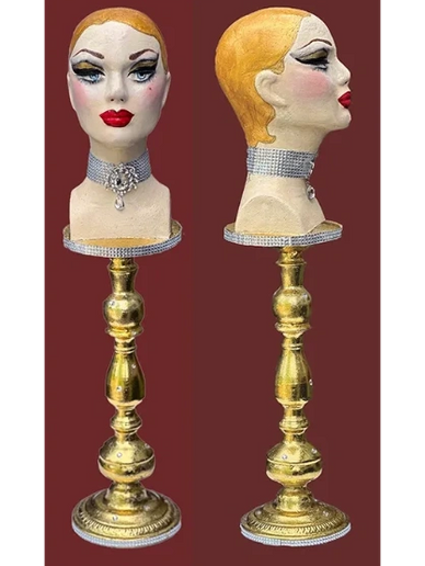 Very glam hat or wig stand. Lots of faux diamonds. A large diamond pin that can be removed and worn by itself. Hand painted. Gold leaf.